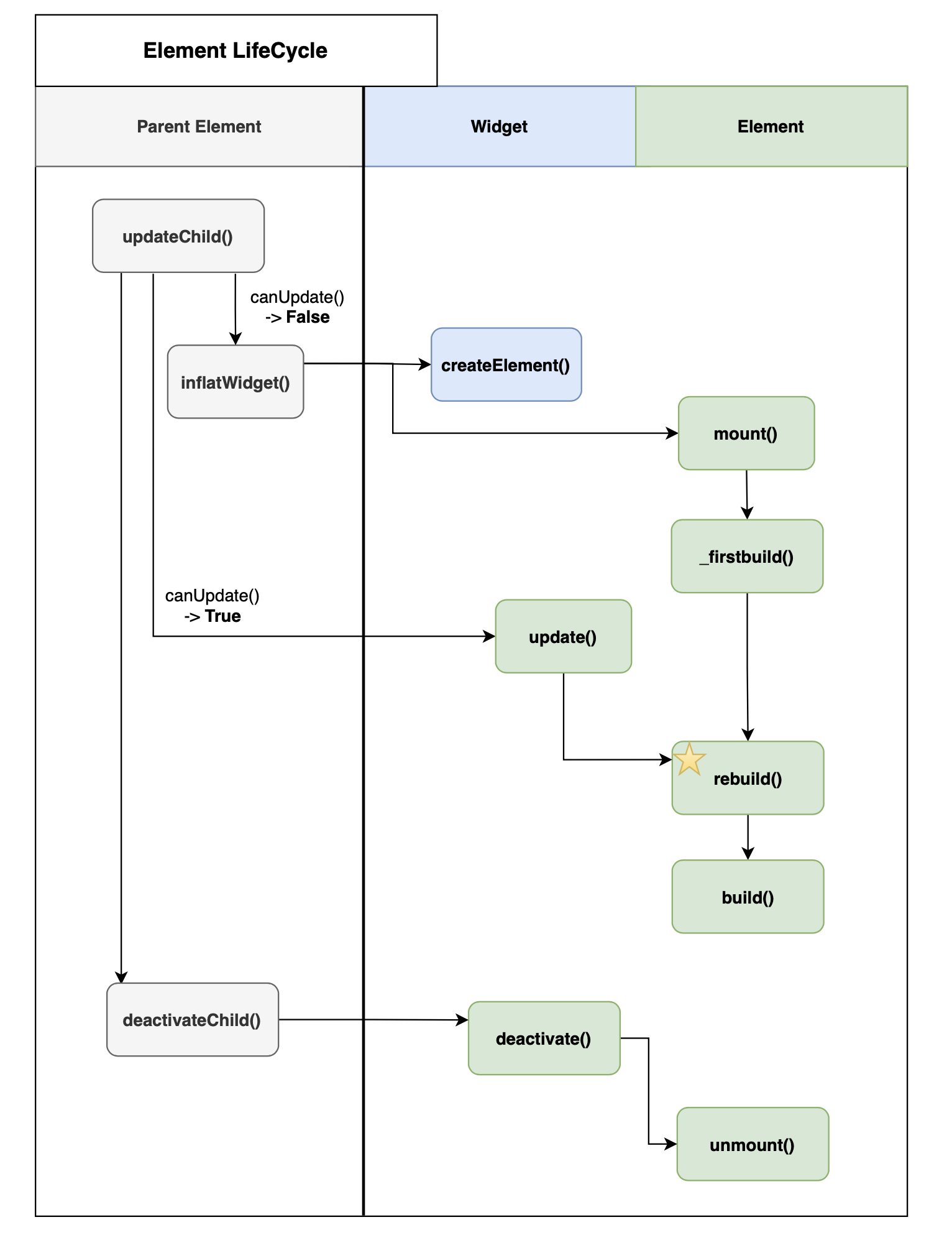 결국 StatefulWidget의 LifeCycle은 State의 LifeCycle이 되는데 State도 StatefulElement의 LifeCycle에 직접적인 영향을 받기 때문에 LifeCycle에 대해서 이야기하려면 Widget이 아닌 Element의 LifeCycle를 알아야 한다.