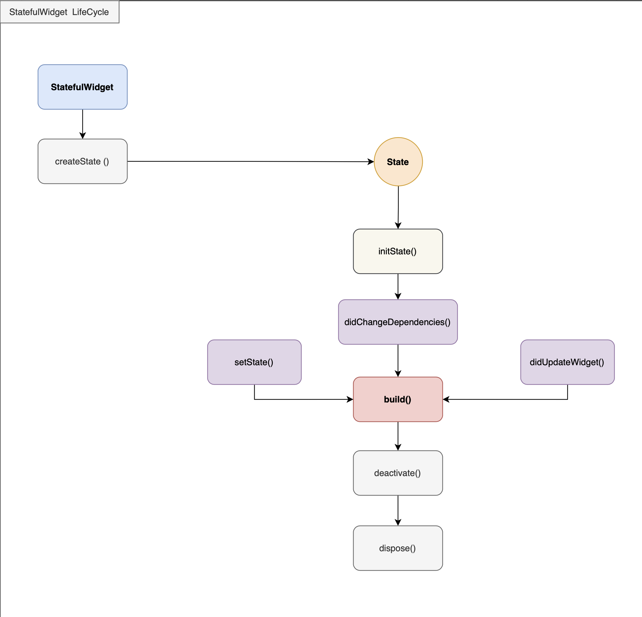 Widget Immutable하기 때문에 LifeCycle을 가질 수 없습니다. 그리고 StatefulWidget의 State 역시 LifeCycle을 가지는 것처럼 보이지만 사실은 Element LifeCycle의 그림자입니다.