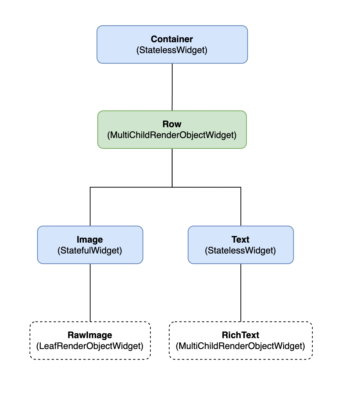 그렇기 때문에 RenderObjectWidget에 대해서만 Widget -> RenderObjectElement -> RenderObject의 관계를 가진다.